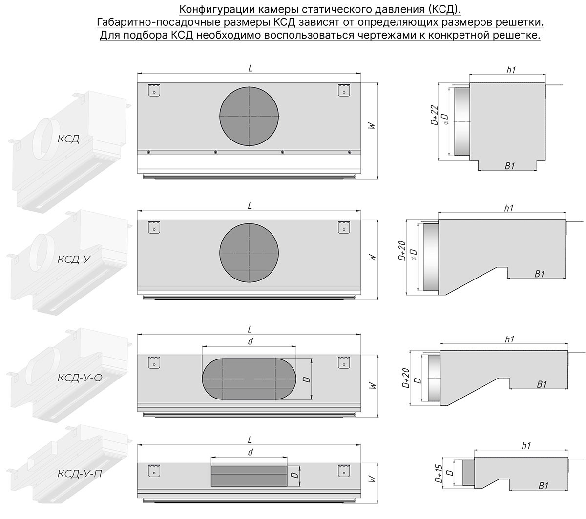 Камера статического давления (КСД/КСР) является элементом систем вентиляции и кондиционирования воздуха и используется для подключения щелевых диффузоров к воздуховоду.