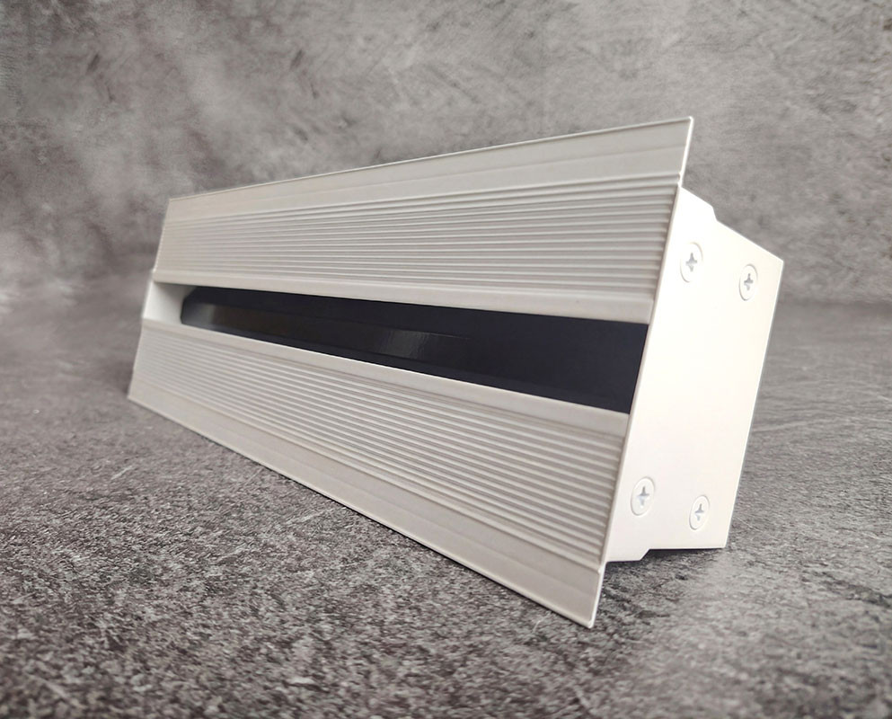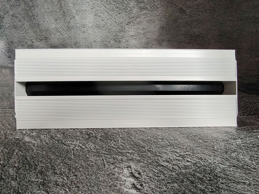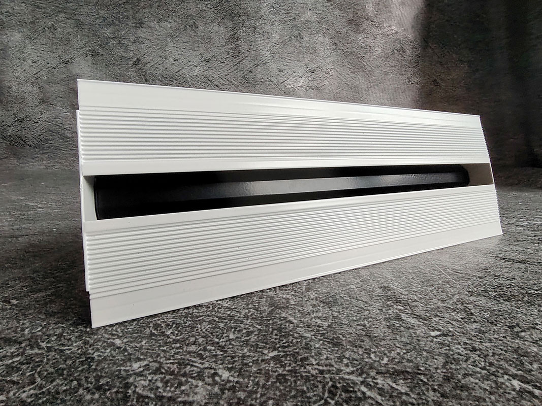 Рамка решетки имеет ребристую поверхность для лучшей адгезии финишного материала отделки. Под шпаклевку в рамке предусмотрена полка 0,9 мм. После монтажа диффузора видимой частью остается лишь щель, образующая лаконичную непрерывную линию.