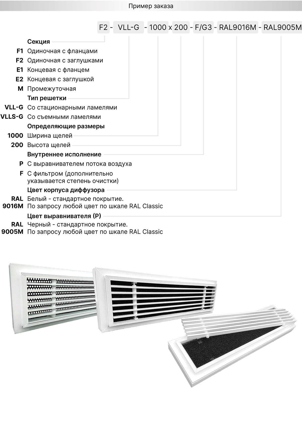 любой размер с шагом 1 мм (минимальный – 200х100 мм, максимальный для VLL-G – 2000х1000 мм, для VLLS-G – 2000х500). - возможна дополнительная комплектация выравнивателем воздуха.